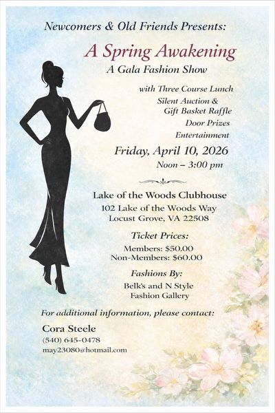 We are is excited to once again produce our Newcomers and Old Friends Spring Fashion Show featuring N Style and Belk fashions. Ticket are now available April 10, 2026 noon till 3:00 pm at the Lake of the Woods clubhouse. Contact Cora Steele 540-645-0478 Email: may23080@hotmail.com