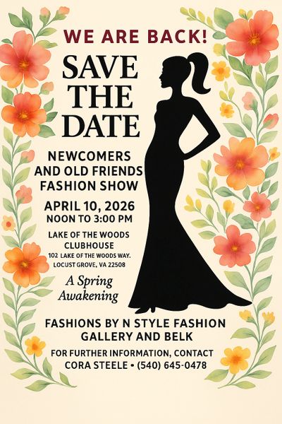 We are is excited to once again produce our Newcomers and Old Friends Fashion Show featuring N Style and Belk fashions. Save the date for April 10, 2026 noon till 3:00 pm at the Lake of the Woods clubhouse.